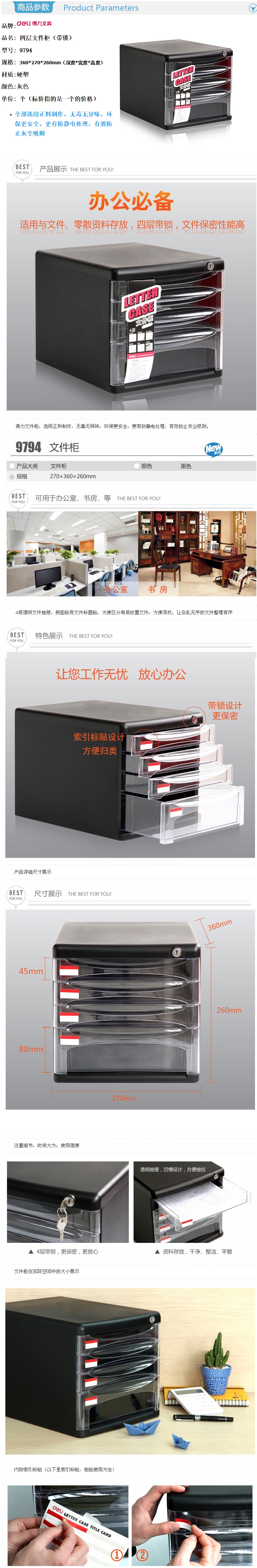 - 商品名稱:得力(deli)9794 四層文件柜(帶鎖,規(guī)格:361*271*260mm)