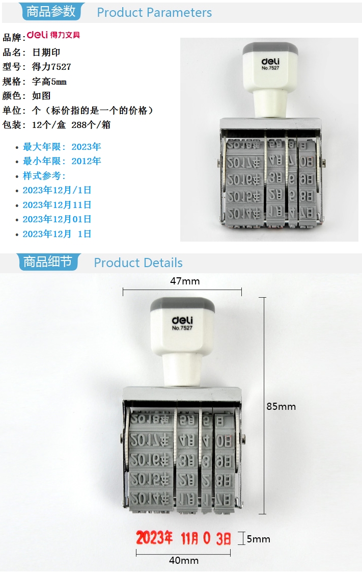 - 商品名稱:得力(deli)日期印 7527(5mm;12個/盒)
