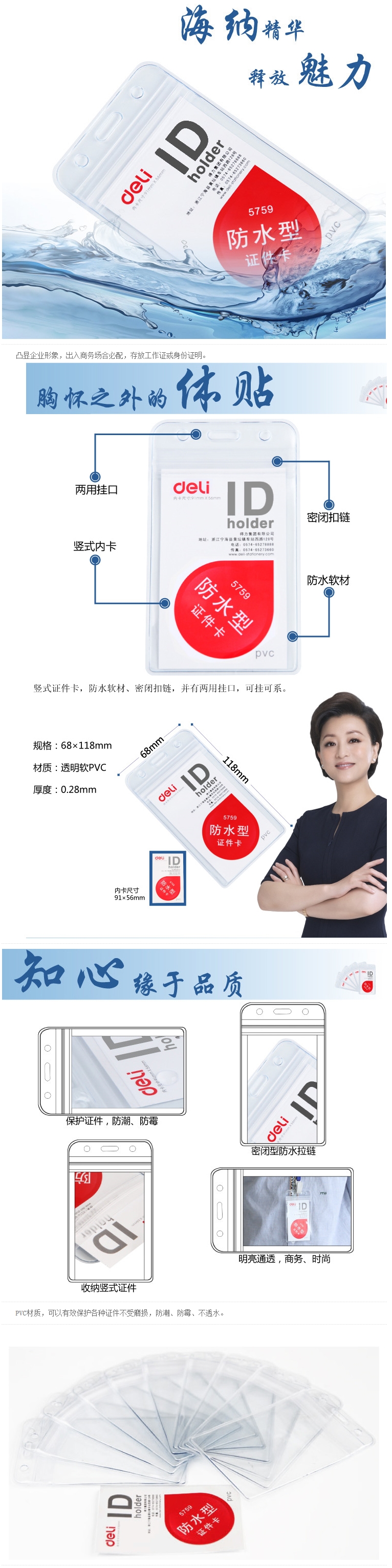 • 商品名稱:得力(deli)PVC透明防水豎式證件卡 5759(10個/包;10包/盒)按包售