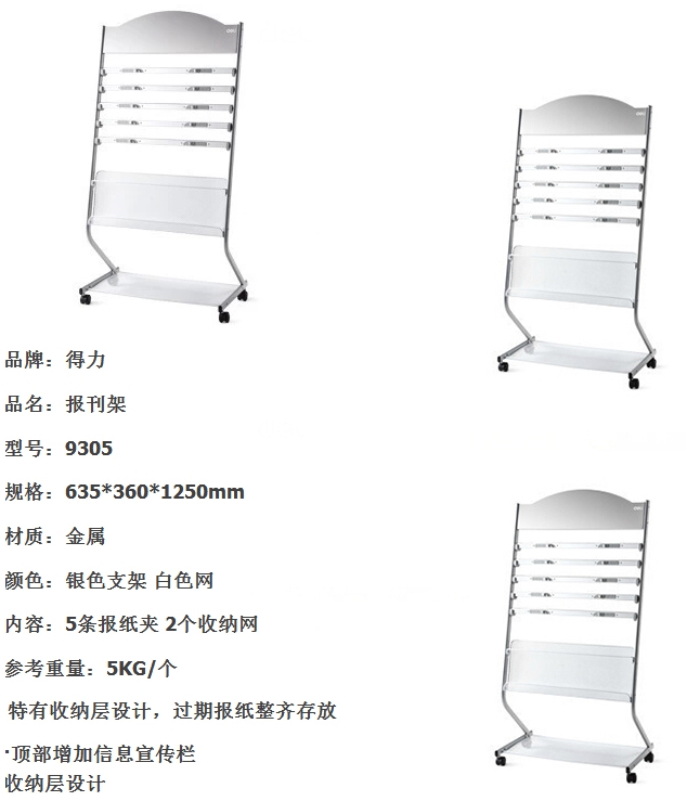 - 商品名稱:得力(deli)9305標(biāo)準(zhǔn)型報(bào)刊架(635*360*1250mm)