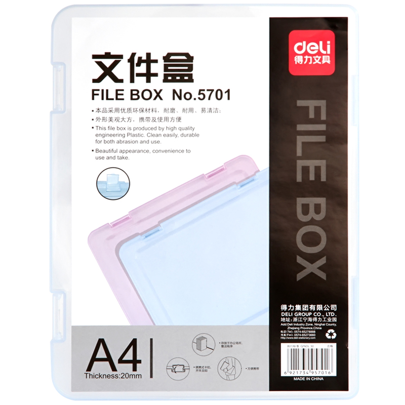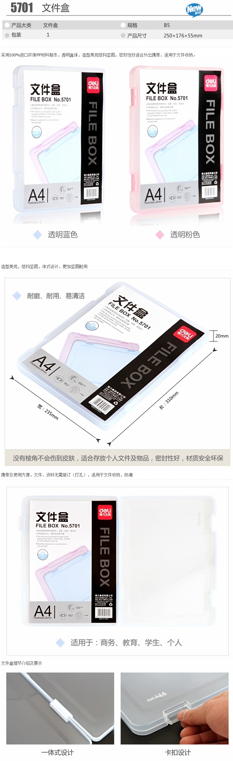 • 商品名稱:得力(deli) 5701透明PP文件盒(規(guī)格:B5;24個/盒)