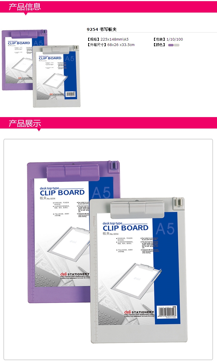 - 商品名稱:得力(deli)A5 塑料板夾 9254(規(guī)格:225*148mm;10只/盒)