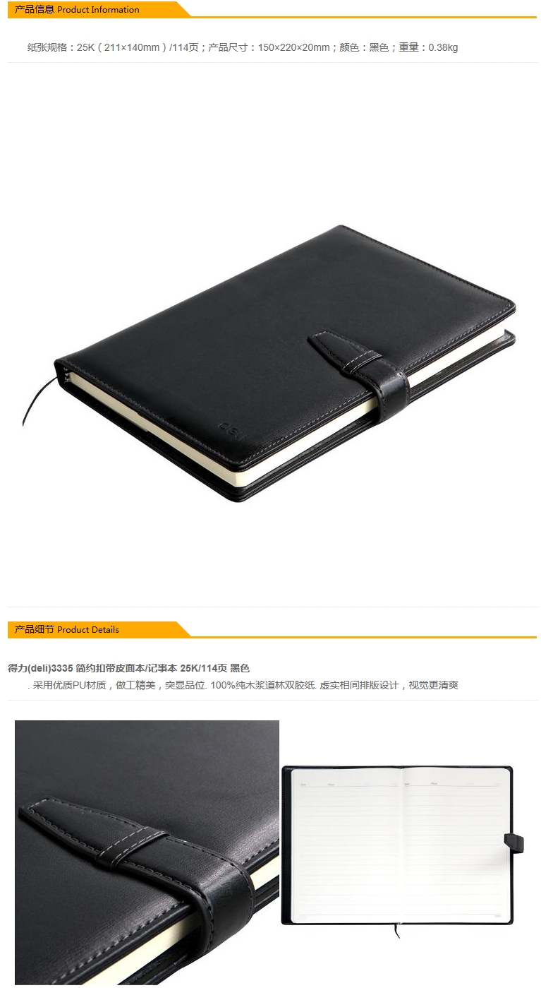 - 商品名稱:得力(deli) 3335 簡約扣帶皮面本/記事本(黑色,25K/114頁)