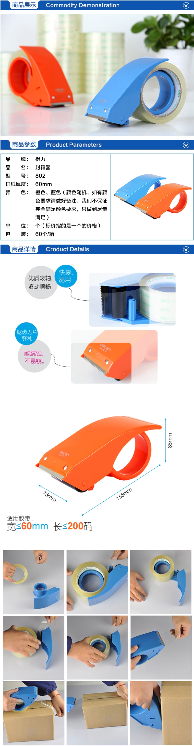 • 商品名稱:得力(deli)塑料封箱器 802(適用≤60mm膠帶寬度,顏色隨機(jī))