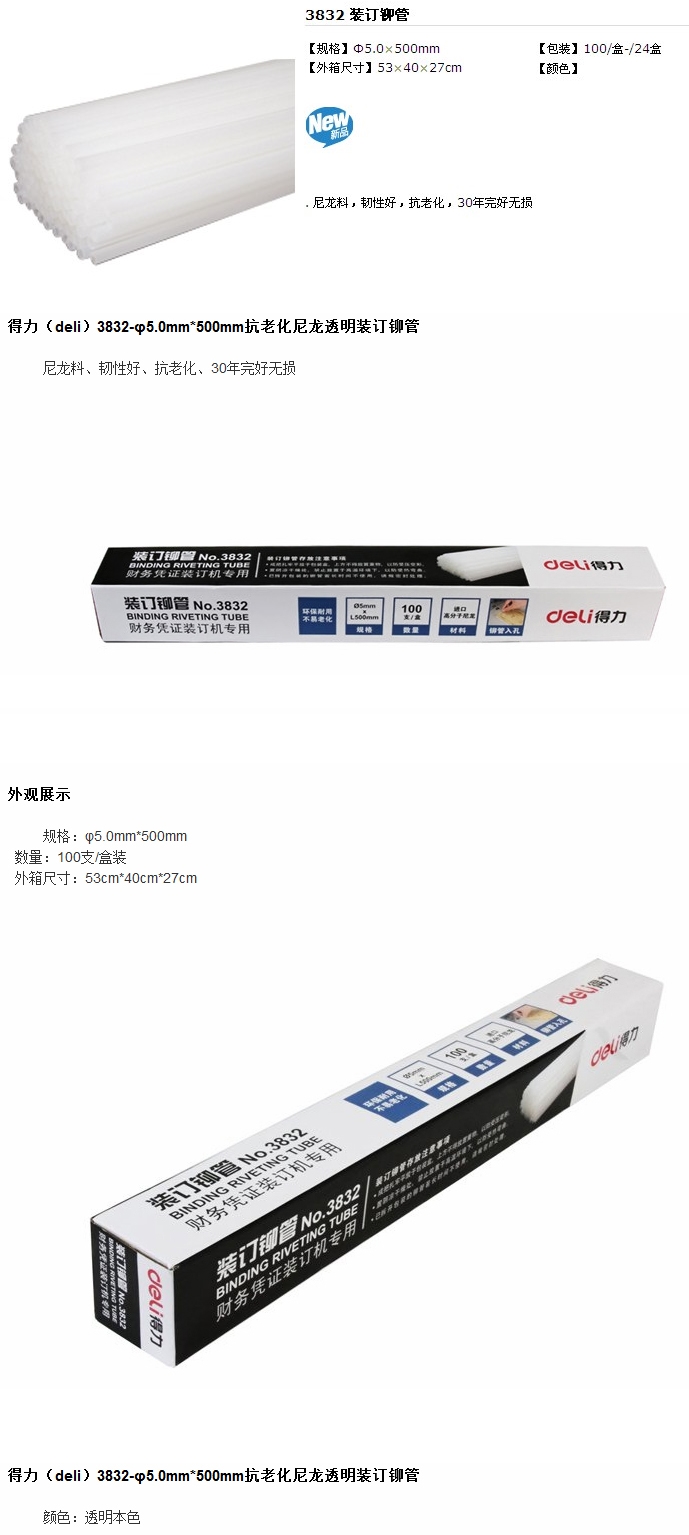 - 商品名稱:得力裝訂鉚管 5.0*500mm 3832(100根/盒;適用3877裝訂機(jī))
