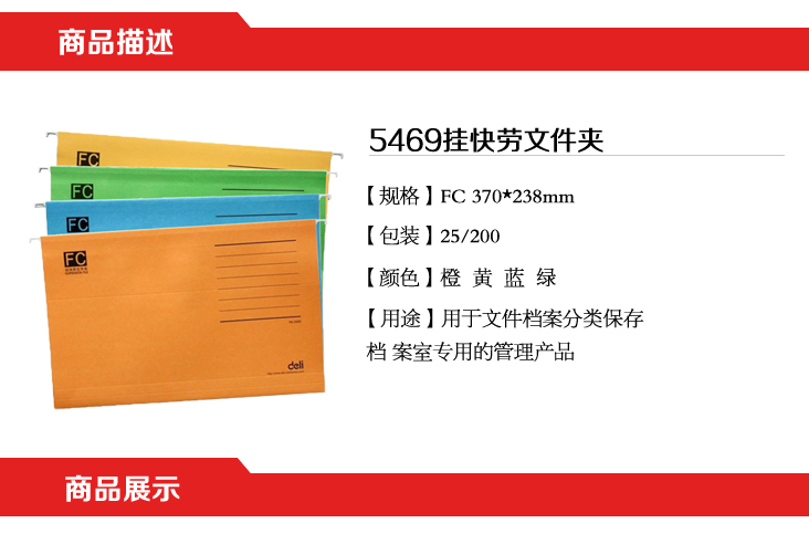 - 商品名稱:得力5469FC掛快勞夾快勞掛四色吊掛式文件夾 25只/盒(按盒售)