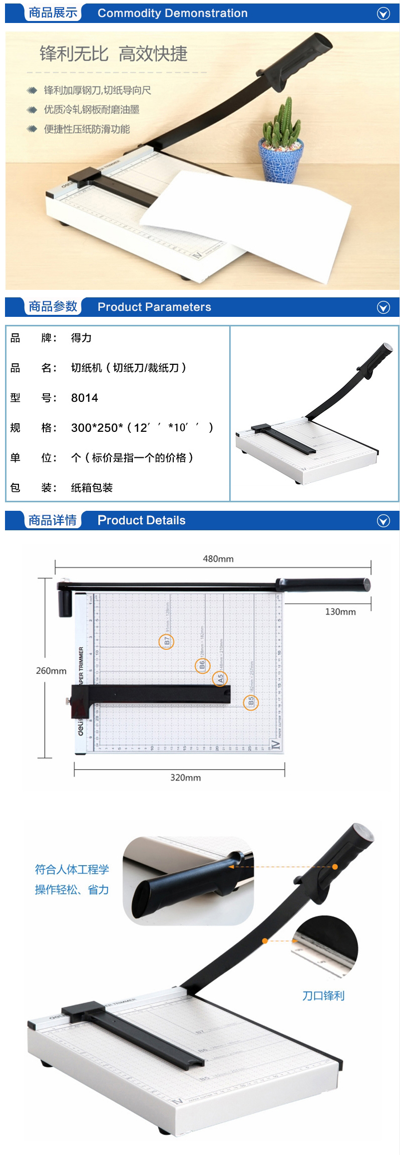• 商品名稱:得力(deli) 8014 鋼質(zhì)切紙機(jī)/切紙刀/裁紙刀/裁紙機(jī) 300mm*250mm(可切A4)