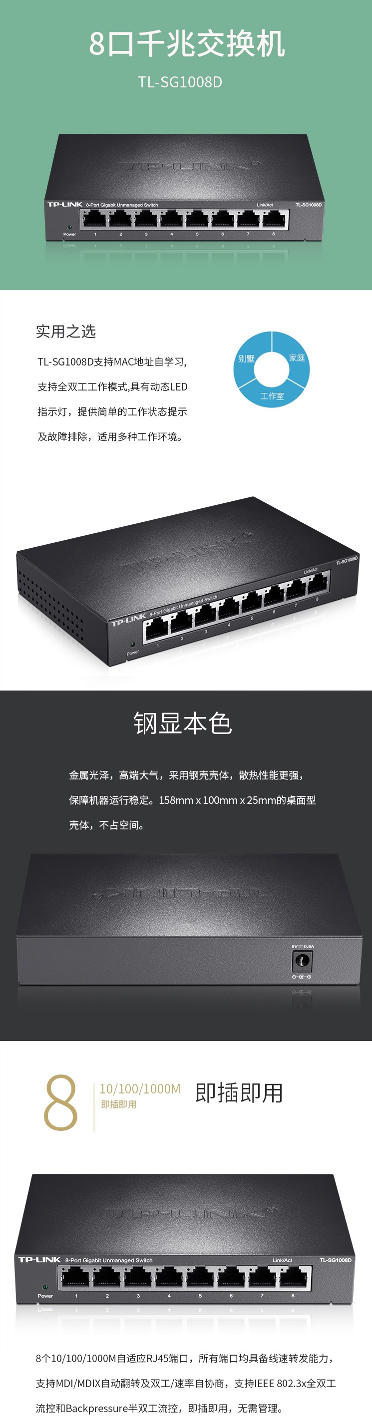 - 商品名稱:TP-LINK 8口千兆交換機 企業(yè)級交換器 監(jiān)控網(wǎng)絡(luò)網(wǎng)線分線器 分流器 金屬機身 TL-SG1008D