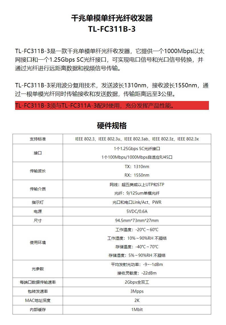 - 商品名稱(chēng):TP-LINK TL-FC311B-3 千兆單模單纖光纖收發(fā)器 光電轉(zhuǎn)換器(單只裝)