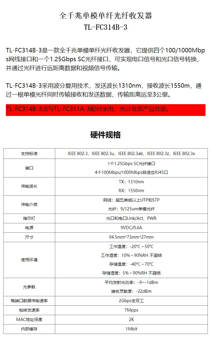 - 商品名稱:TP-LINK TL-FC314B-3 千兆單模單纖光纖收發(fā)器 1SC+4GE光電轉(zhuǎn)換器(單只裝)