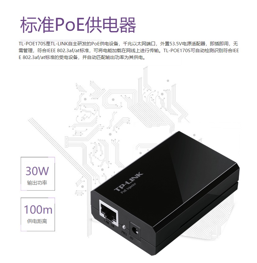 - 商品名稱:TP-LINK 標準PoE供電器 IEEE 802.3af/at 千兆端口 30W TL-POE170S