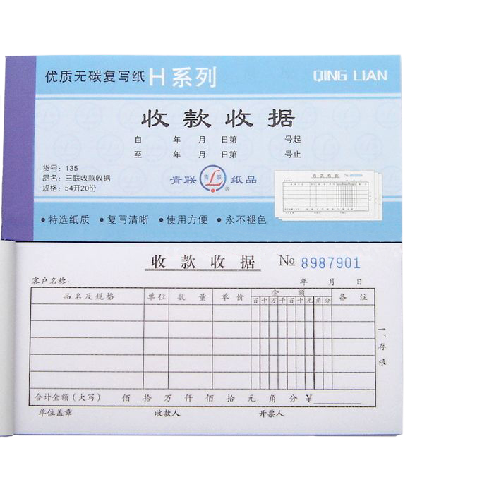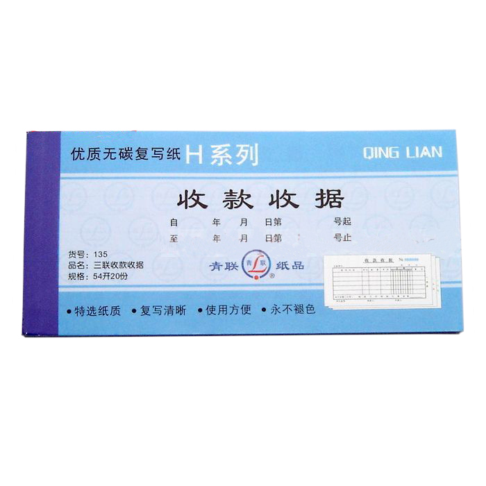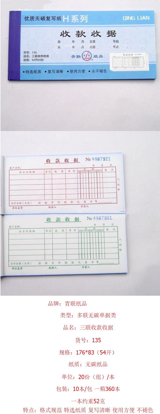 • 商品名稱:青聯(lián)三聯(lián)無碳多欄式收款收據(jù) 135(54開,20份/本,10本/封)