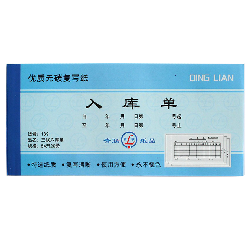 青聯(lián)三聯(lián)無碳入庫單 139(54開,20份/本,10本/封)