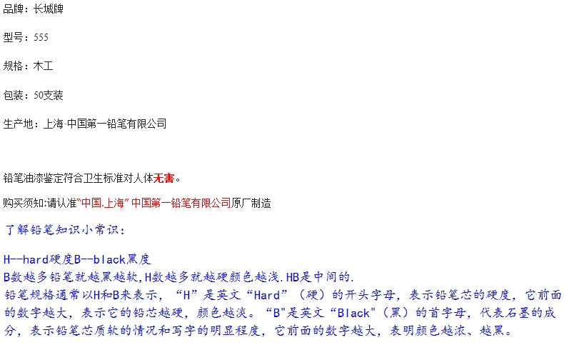 • 商品名稱:長(zhǎng)城牌 555 木工鉛筆 (50支/包,250支/盒)按包售