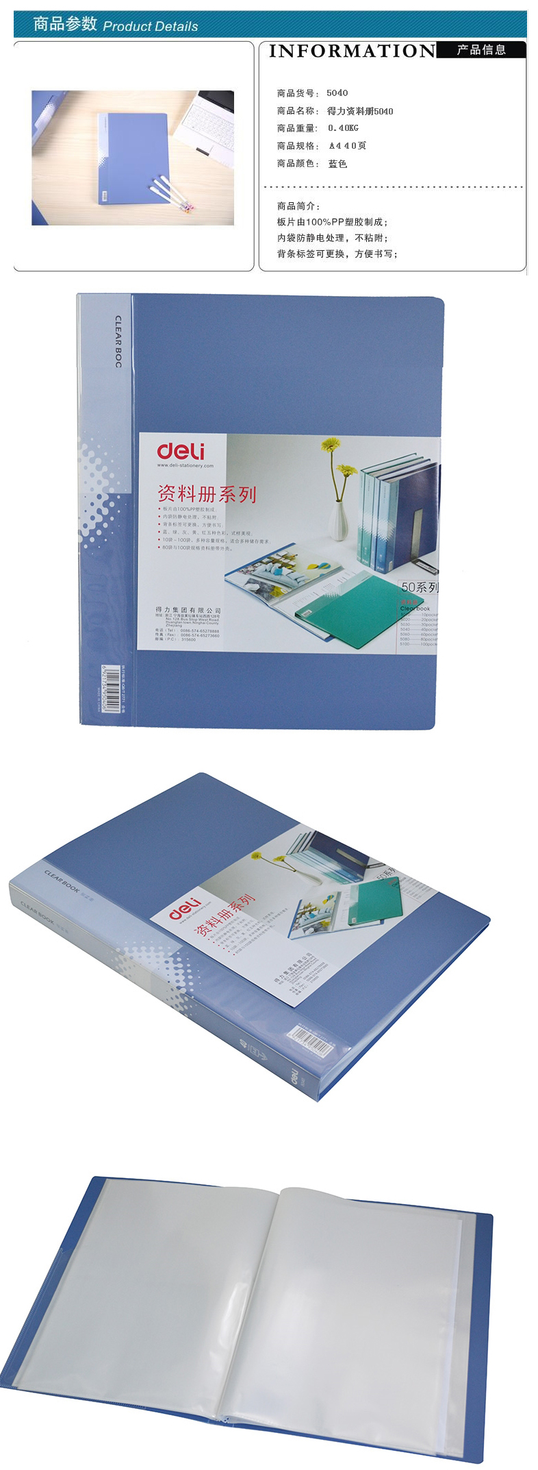 - 商品名稱:得力(deli) 5040 無襯紙資料冊 A4 40頁 藍色(12本/箱)