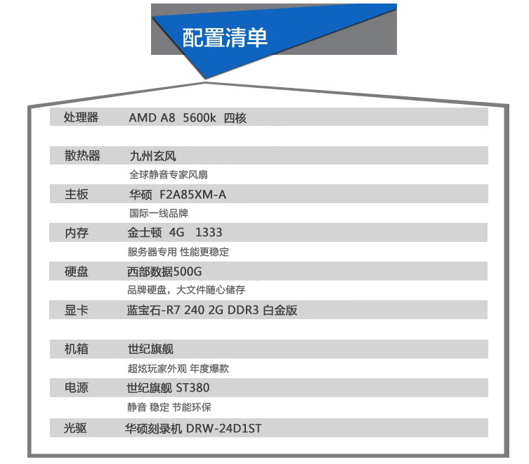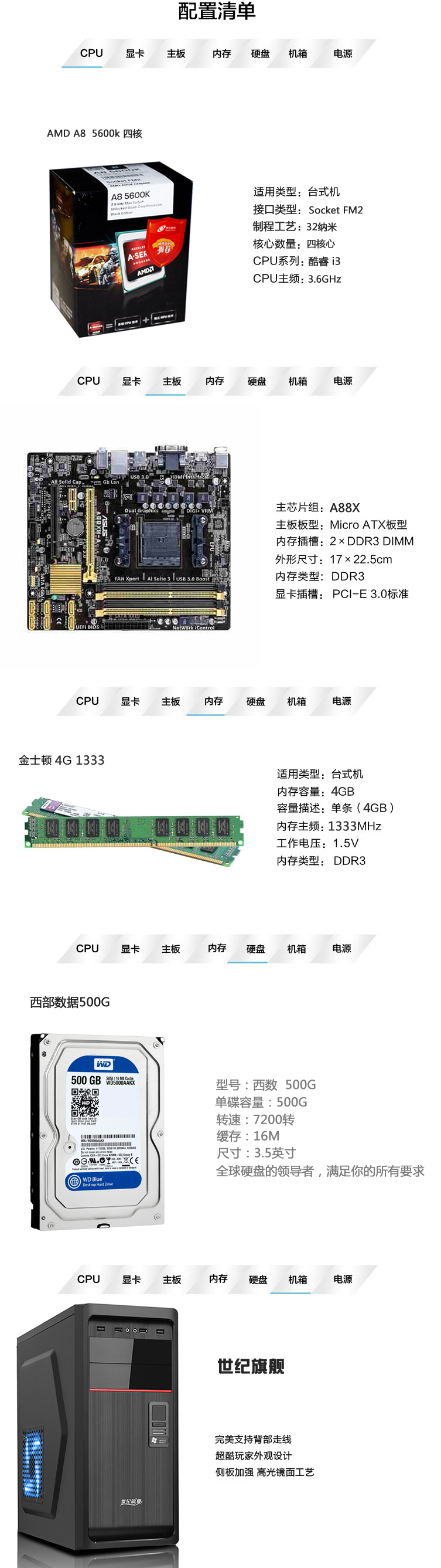 - 商品名稱:世紀(jì)旗艦 AMD A8 5600k 四核/金士頓4G /華碩F2A85XM-A/西部數(shù)據(jù)500G/華碩DRW-24D1ST/組裝機(jī)電腦