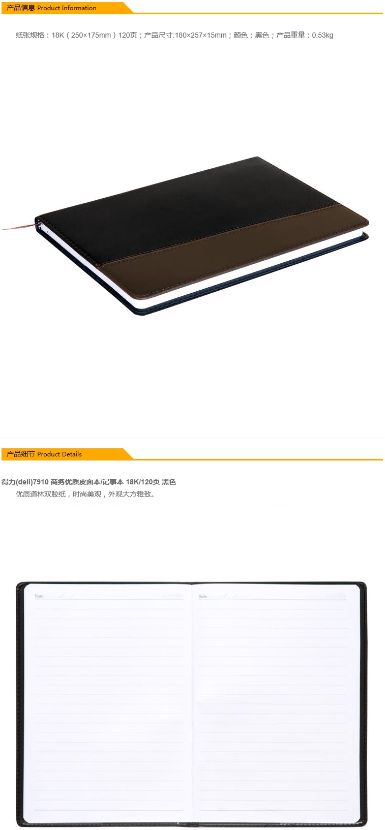 - 商品名稱:得力(deli) 7910 商務(wù)皮面本/記事本(黑色,18K/120張)