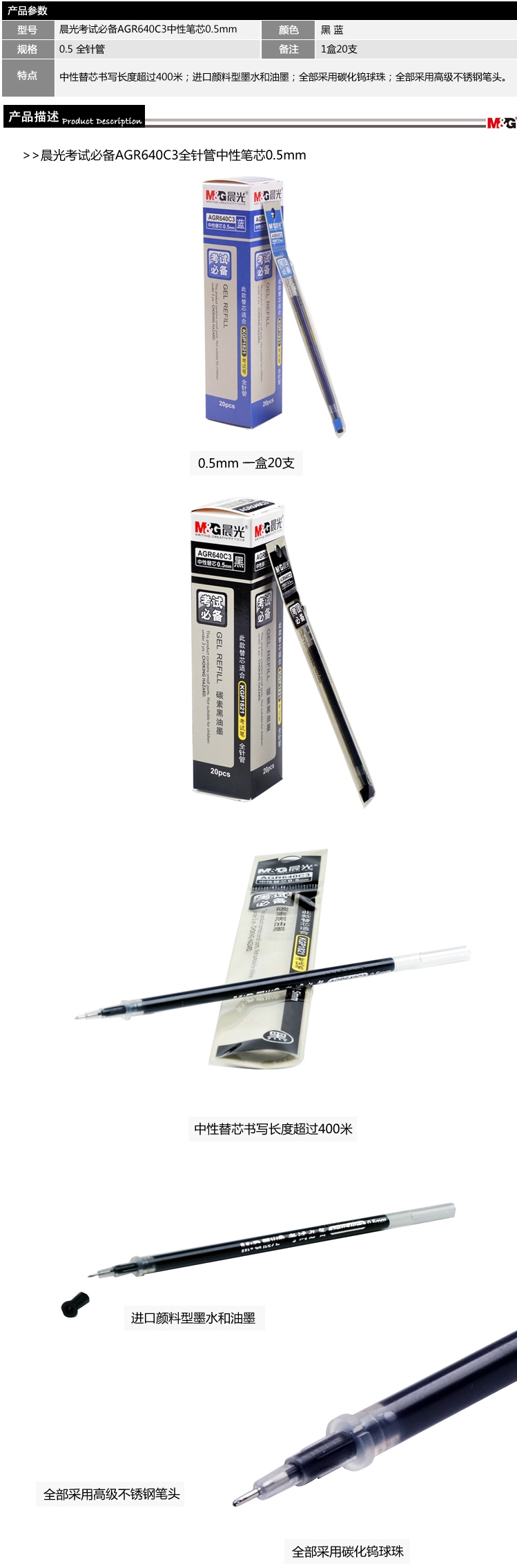 • 商品名稱:晨光(M&G)AGR640C3 0.5mm 針管型中性筆芯(黑色,20支/盒)按盒售