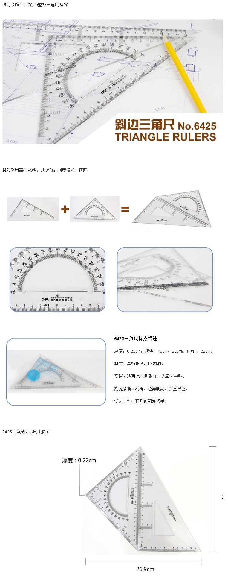 • 商品名稱:得力(deli)斜邊三角尺 25cm 6425(24套/盒)