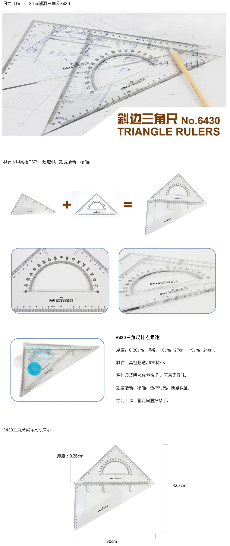 • 商品名稱:得力(deli)斜邊三角尺 30cm 6430(24套/盒)