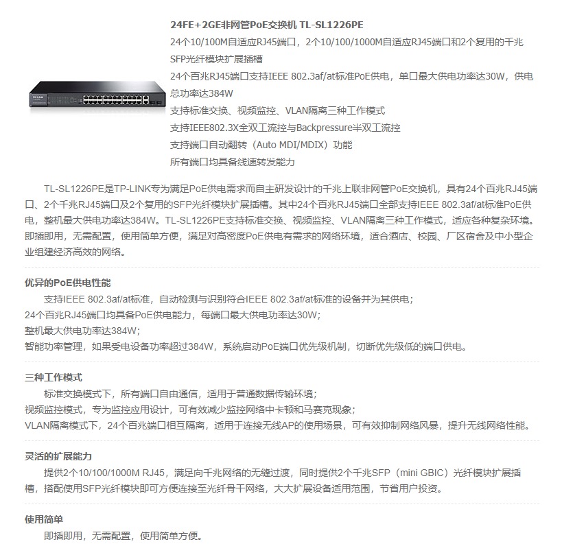 - 商品名稱:TP-LINK SL1226PE 24口百兆POE交換機 2千兆口+2千兆光纖口