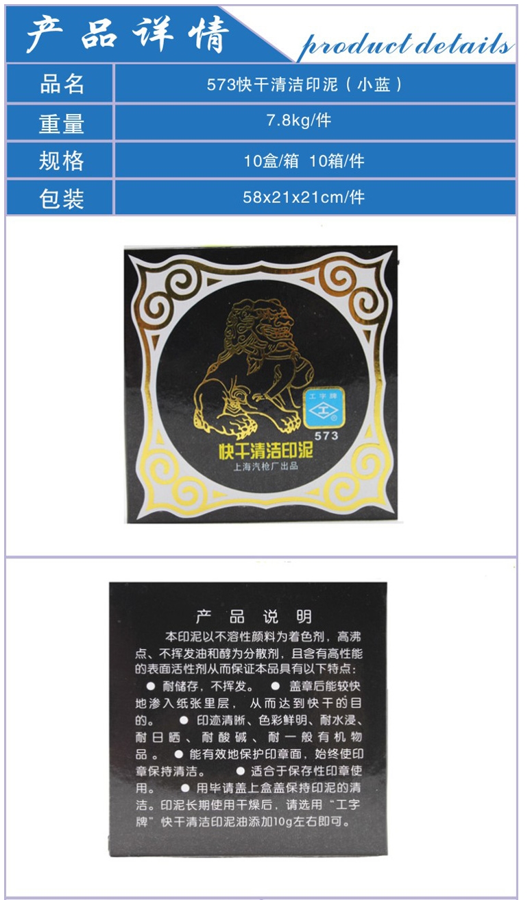 - 商品名稱:工字快干清潔印泥(藍(lán)) 573(10個/盒)