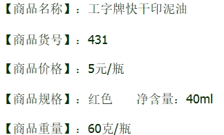 - 商品名稱(chēng):工字快干清潔印泥油(紅) 431(40ml/瓶,10瓶/封)