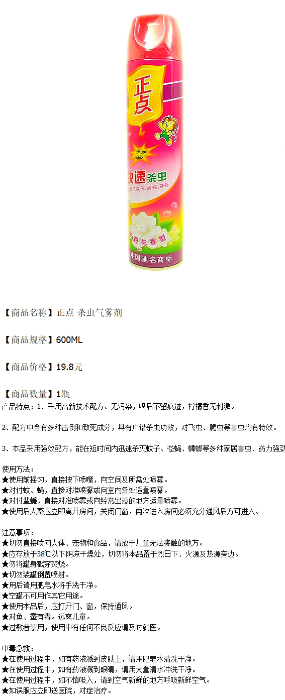 • 商品名稱:正點(diǎn)殺蟲劑 清香型(600ml/瓶,24瓶/箱)